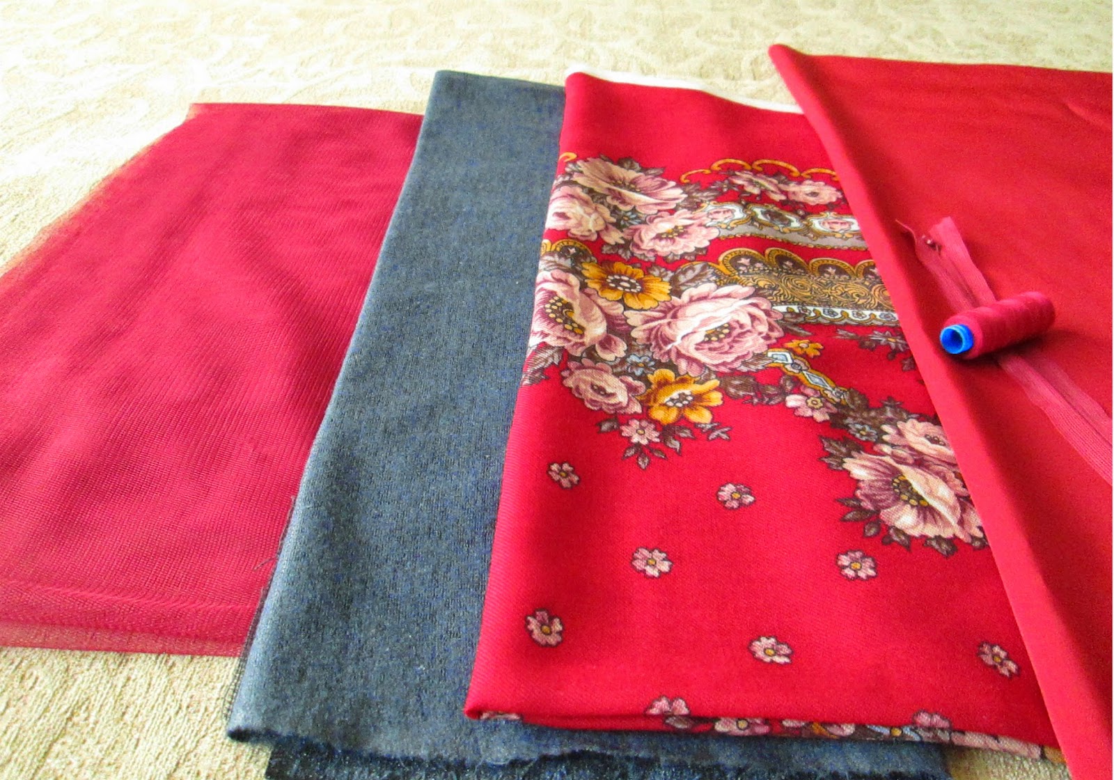 В изготовлении юбки использована подходящая по цвету красная костюмная ткань, сетчатая ткань для подкладки, клеевая на тканевой основе, а так же фурнитура: потайная застежка-молния и брючный крючок.